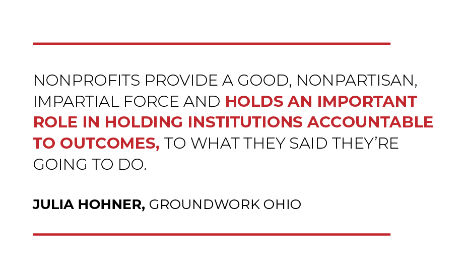 “Nonprofits provide a good, nonpartisan, impartial force and holds an important role in holding institutions accountable to outcomes, to what they said they’re going to do,” Hohner says. “We are able to share data that stakeholders otherwise wouldn’t be able to see — to tell a clear story of how our state’s most at-risk children are faring.”