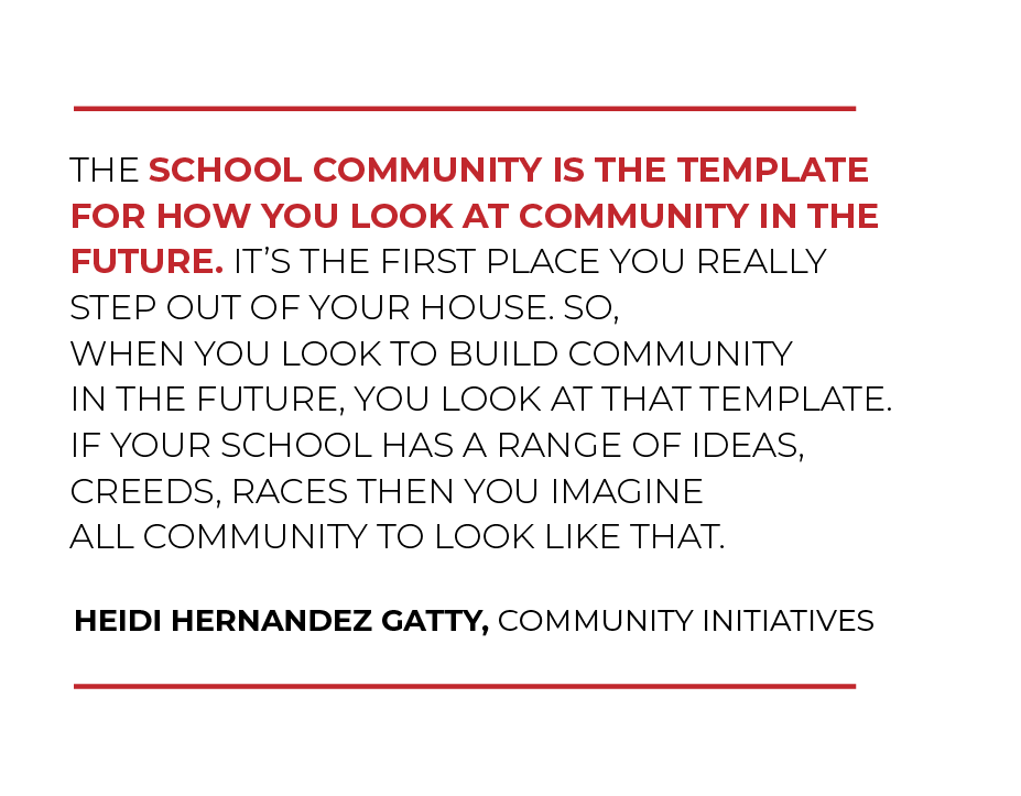 “[The school] community is different than other kinds of community,” Hernandez Gatty, Community Initiatives’ VP of Client Services says. “Personally, I think it’s critically important to students because the school community is the template for how you look at community in the future. It’s the first place you really step out of your house. So, when you look to build community in the future, you look at that template. If your school has a range of ideas, creeds, races then you imagine all community to look like that.”