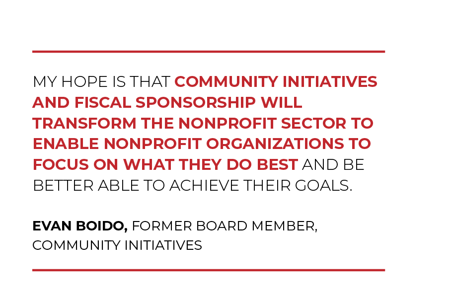 “As a Human Resources consultant, I often consulted with small nonprofit organizations that I believe would have been better served by being fiscally sponsored,” said Evan. “My hope is that Community Initiatives and fiscal sponsorship will transform the nonprofit sector to enable nonprofit organizations to focus on what they do best and be better able to achieve their goals.”